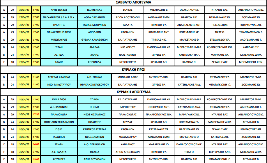 ΤοπικόΤοπικό Χανίων: Οι διαιτητές των αγώνων του Σαββατοκύριακου 27 Απρ Ορίστηκαν οι διαιτητές των αγώνων του Σαββατοκύριακου (29 και 30 Απριλίου) για τις τρεις κατηγορίες του τοπικού Χανίων. Αναλυτικά οι διαιτητές: