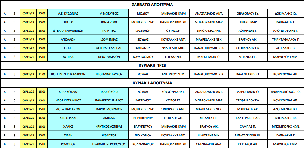 Το βράδυ της Πέμπτης (3/11) η ΕΠΣ Χανίων γνωστοποίησε τους διαιτητές των προσεχών αγώνων Α’ και Β’ κατηγορίας.