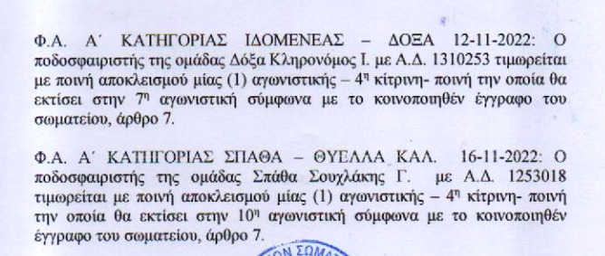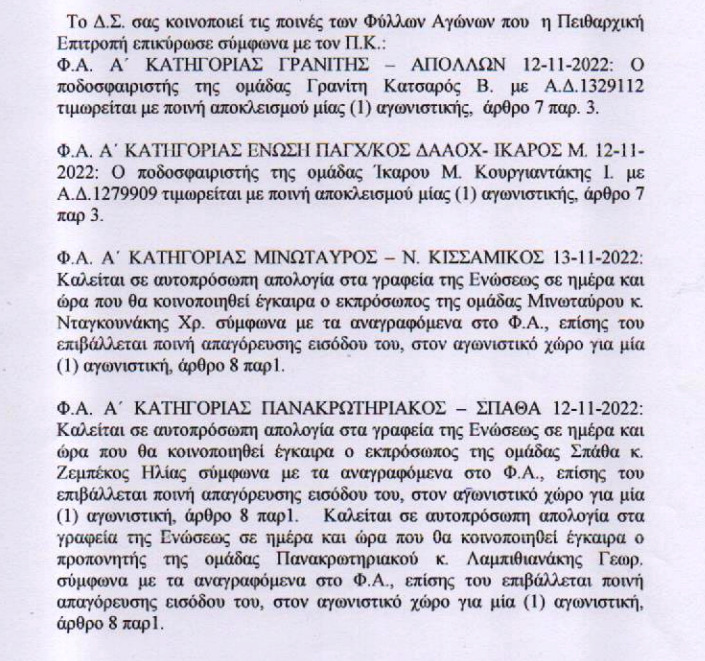 Δείτε το ποινολόγιο που ανακοίνωσε η ΕΠΣΧ την Παρασκευή (18/11).