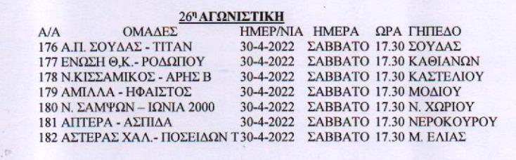 Η ΕΠΣ Χανίων ανακοίνωσε το πρόγραμμα της τελευταίας αγωνιστικής στη Β’ ΕΠΣ Χανίων.