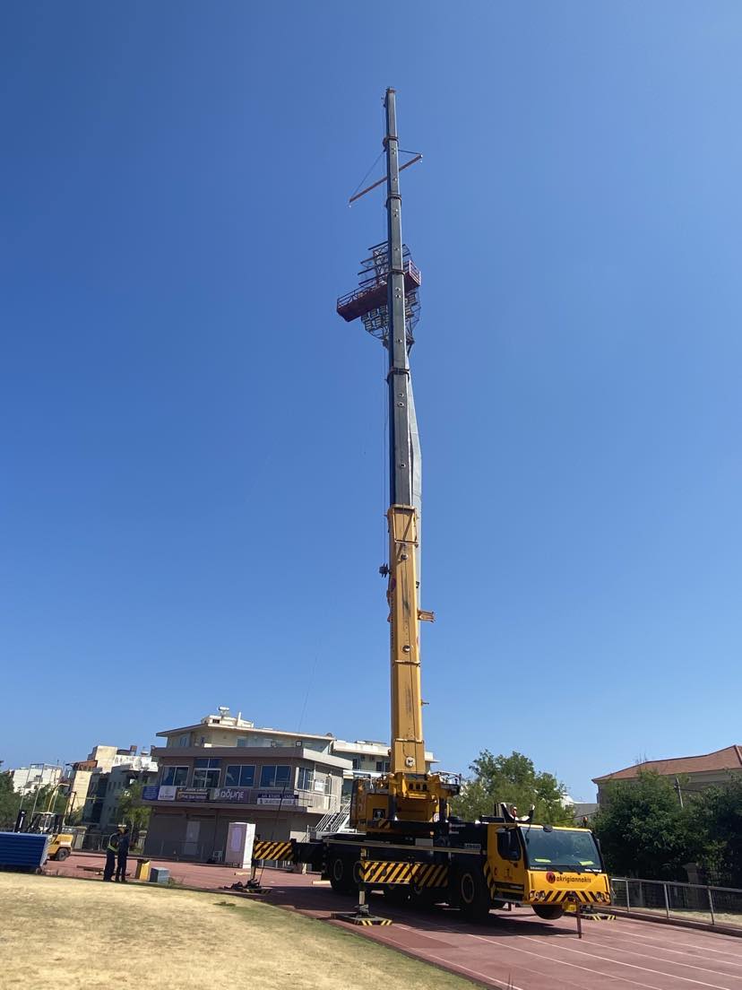 Μπήκε ο γερανός στο Εθνικό Στάδιο Χανίων και ξεκίνησαν οι εργασίες για την στόχευση των πυλώνων ηλεκτροφωτισμού.