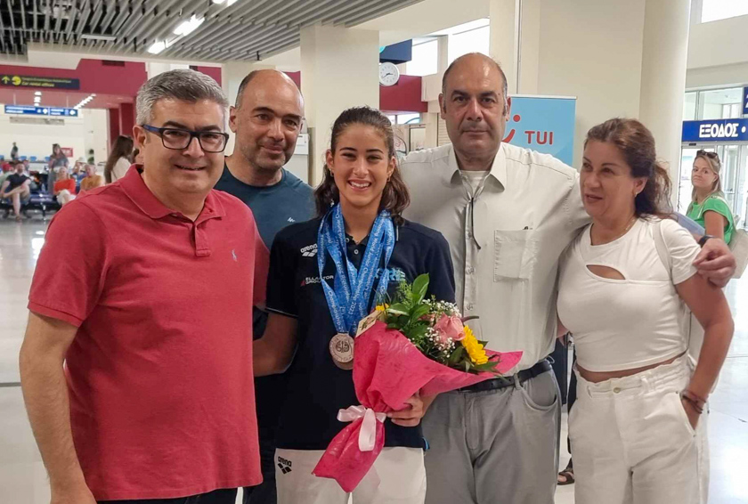 Η αίθουσα αφίξεων του αεροδρομίου Χανίων “Ιωάννης Δασκαλογιάννης” πλημμύρισε από φωνές και ενθουσιασμό για να υποδεχθεί την Γεωργία Περάκη, γεγονός αναμενόμενο μετά τη… θραύση που προκάλεσε στο πλαίσιο της συμμετοχής της στο παγκόσμιο πρωτάθλημα τεχνικής κολύμβησης που διεξήχθη στο Κάιρο της Αιγύπτου.