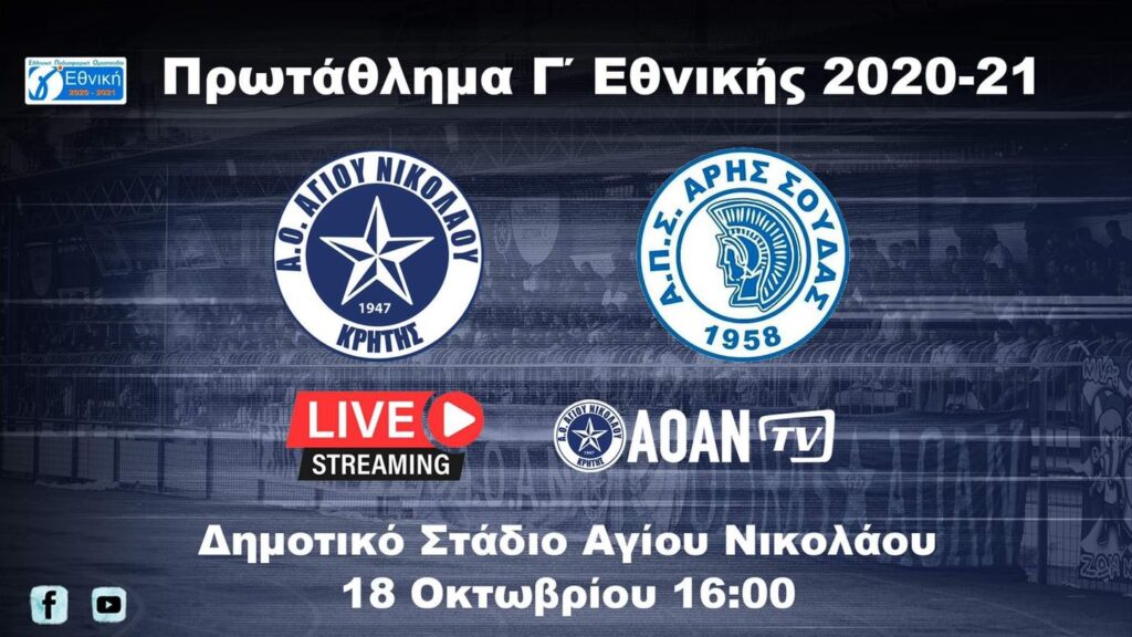Η πρώτη αγωνιστική για το πρωτάθλημα της Γ’εθνικής ανάμεσα στον ΑΟΑΝ και τον Άρη Σουδας σε ζωντανή μετάδοση (#livestreaming) από το AOAN TV τη Κυριακή 18 Οκτωβρίου στις 16:00 από το Δημοτικό Στάδιο Αγίου Νικολάου